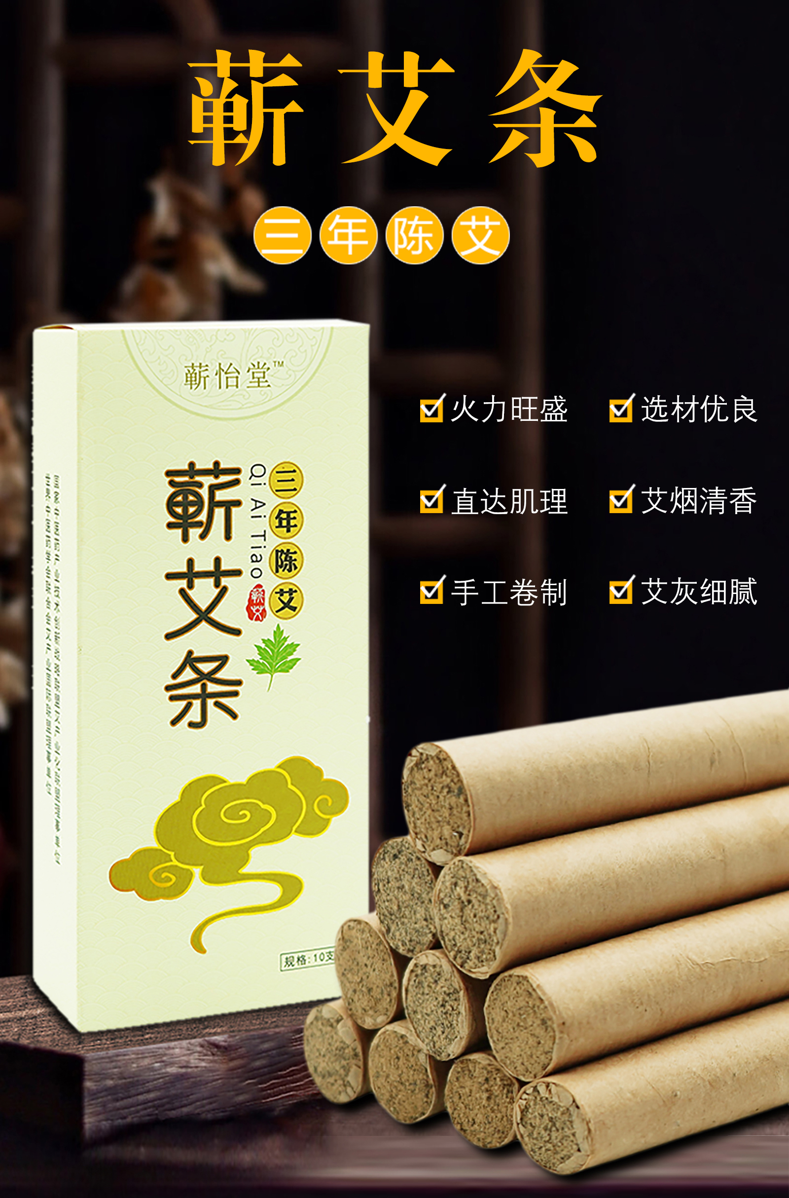 蕲怡堂三年陈艾条 10支/盒 艾草纯艾绒家用正品 同款艾条无烟